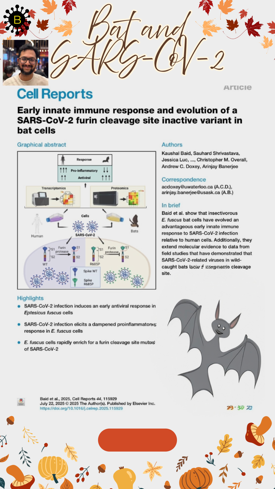 Victoria Gonzalez*, Briallen Lobb, Jacob Côté, Arkadeb Bhuinya*, Renata Fleith, Akarin Asavajaru, Yan Zhou, Vikram Misra, Darryl Falzarano, Linfa Wang, Sophie Gobeil, Trevor Sweeney, Andrew Doxey, and Arinjay Banerjee (*trainees) (2025). Bat-specific adaptations in interferon signaling and GBP1 contribute to enhanced antiviral capacity. Nature Communications