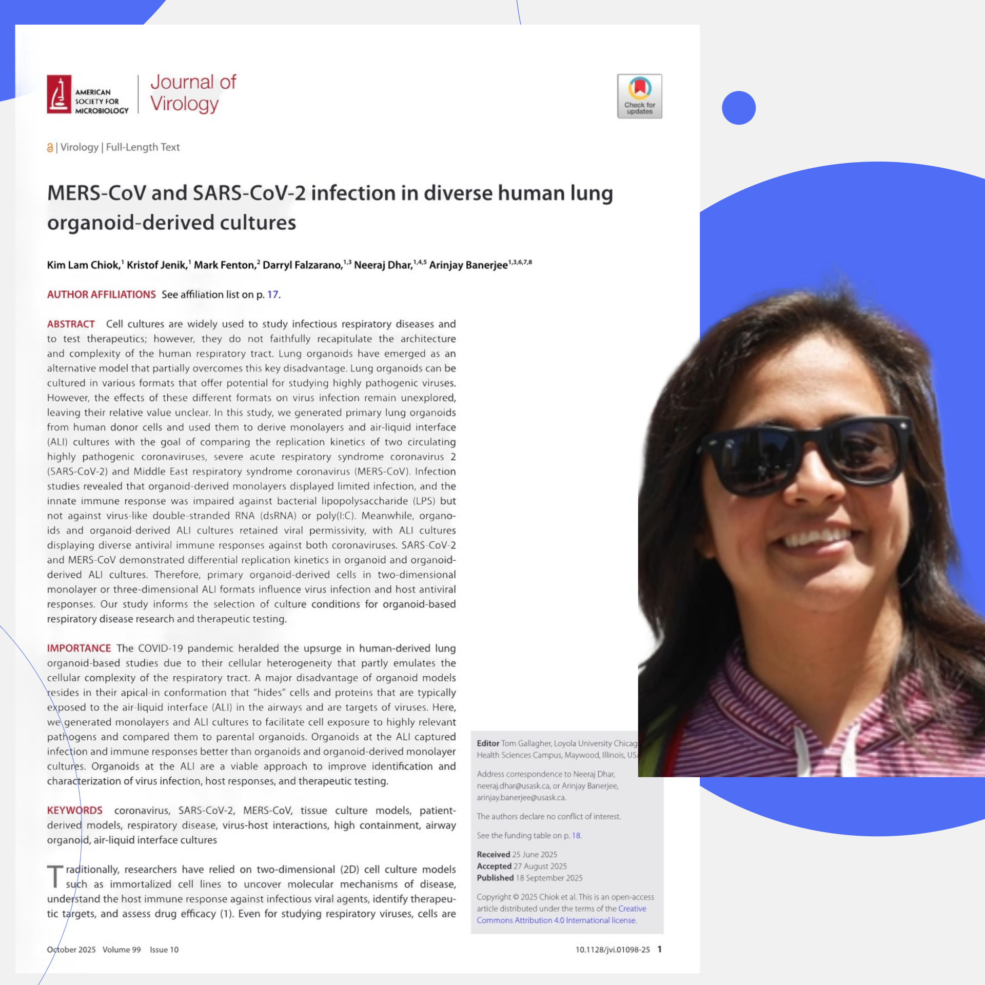 Kim Chiok*, Kristof Jenik*, Mark Fenton, Darryl Falzarano, Neeraj Dhar, and Arinjay Banerjee (*trainees) (2025). Impact of cell culture systems on SARS-CoV-2 and MERS-CoV infection dynamics and antiviral responses. Journal of Virology
