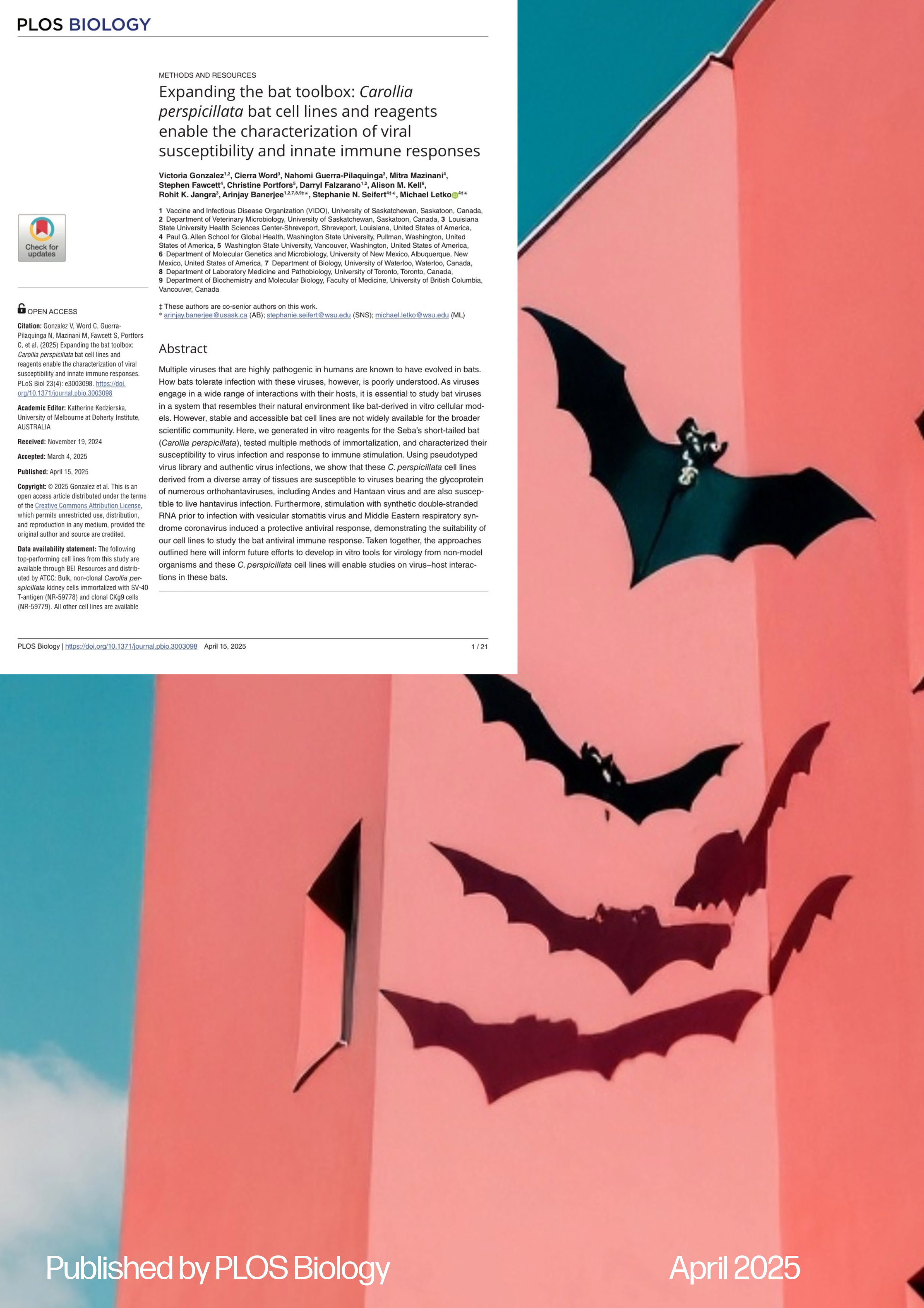Victoria Gonzalez*, Cierra Word, Nahomi Guerra-Pilaquinga, Mitra Mazinani, Stephen Fawcett, Christine Portfors, Darryl Falzarano, Alison M. Kell, Rohit K. Jangra, Arinjay Banerjee^, Stephanie N. Seifert^, Michael Letko^ (*trainee, ^co-corresponding and co-senior authors) (2025). Expanding the bat toolbox: Carollia perspicillata bat cell lines and reagents enable the characterization of viral susceptibility and innate immune responses. PLOS Biology