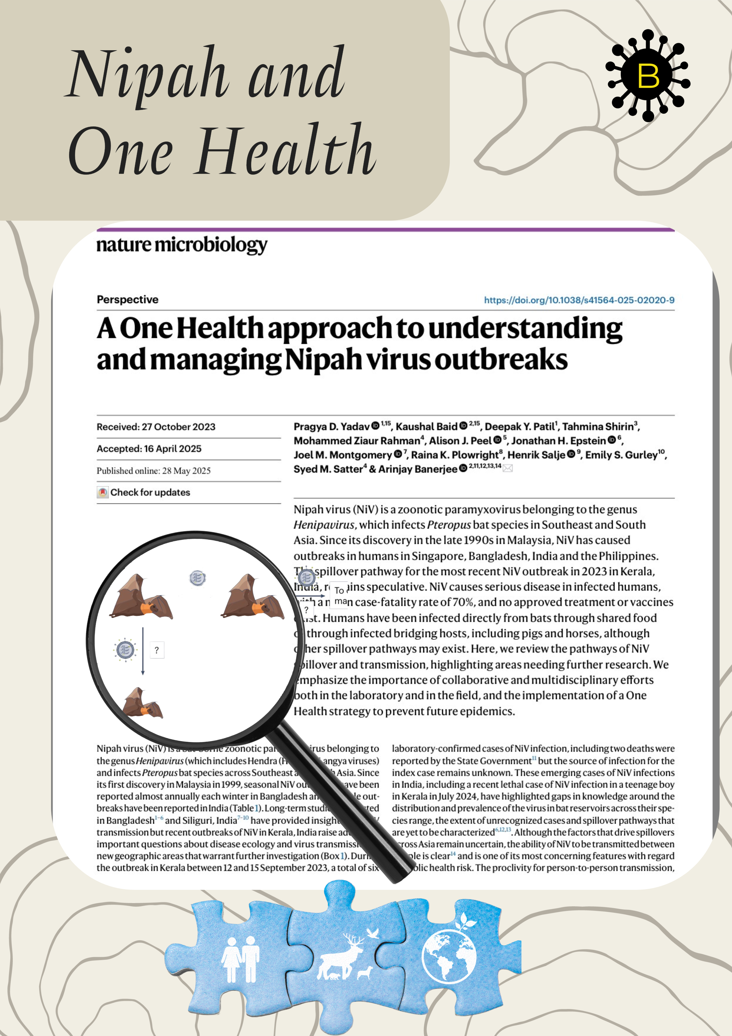 Pragya D. Yadav, Kaushal Baid*, Deepak Y. Patil, Tahmina Shirin, Mohammed Ziaur Rahman, Alison J. Peel, Jonathan H. Epstein, Joel M. Montgomery, Raina K. Plowright, Henrik Salje, Emily S. Gurley, Syed M. Satter and Arinjay Banerjee (*trainee) (2025). A One Health approach to understanding and managing Nipah virus outbreaks. Nature Microbiology
