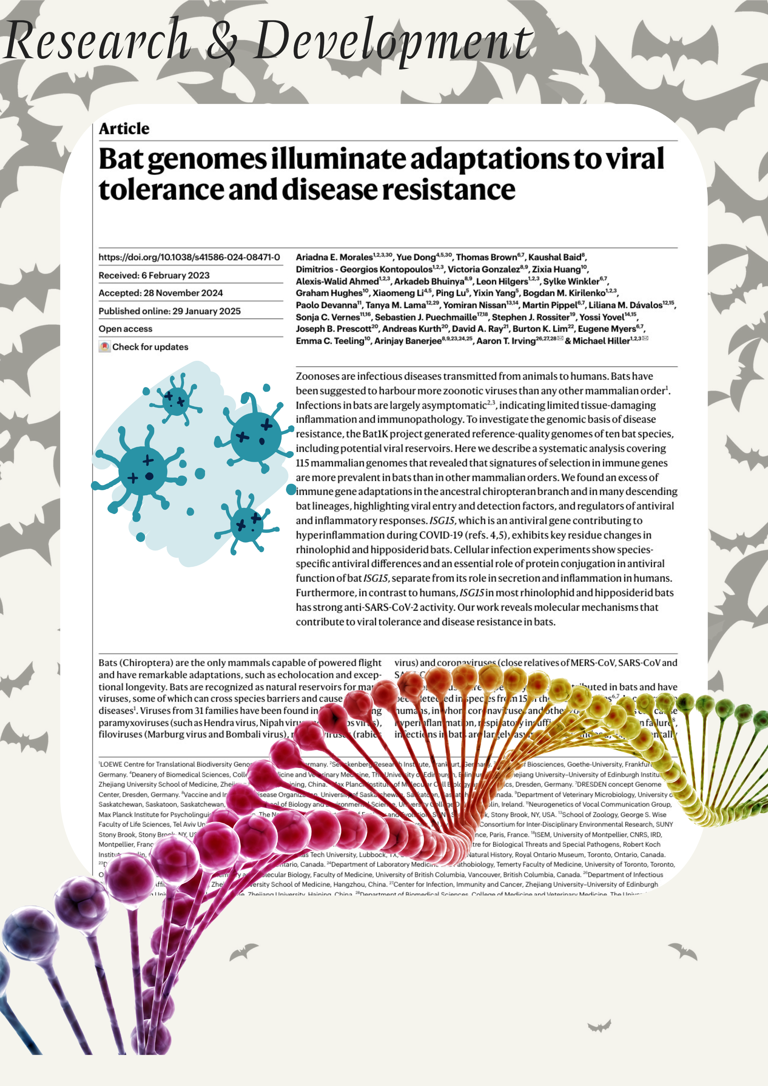 Ariadna E. Morales, Yue Dong, Thomas Brown, Kaushal Baid*, Dimitrios-Georgios Kontopoulos, Victoria Gonzalez*, Zixia Huang, Alexis-Walid Ahmed, Arkadeb Bhuinya*, Leon Hilgers, Sylke Winkler, Graham Hughes, Xiaomeng Li, Ping Lu, Yixin Yang, Bogdan M. Kirilenko, Paolo Devanna, Tanya M. Lama, Yomiran Nissan, Martin Pippel, Liliana M. Dávalos, Sonja C. Vernes, Sebastien J. Puechmaille, Stephen J. Rossiter, Yovel Yossi, Joseph B. Prescott, Andreas Kurth, David A. Ray, Burton K. Lim, Eugene Myers, Emma C. Teeling, Arinjay Banerjee, Aaron T. Irving and Michael Hiller (*trainees) (2025). Bat genomes illuminate adaptations to viral tolerance and disease resistance. Nature